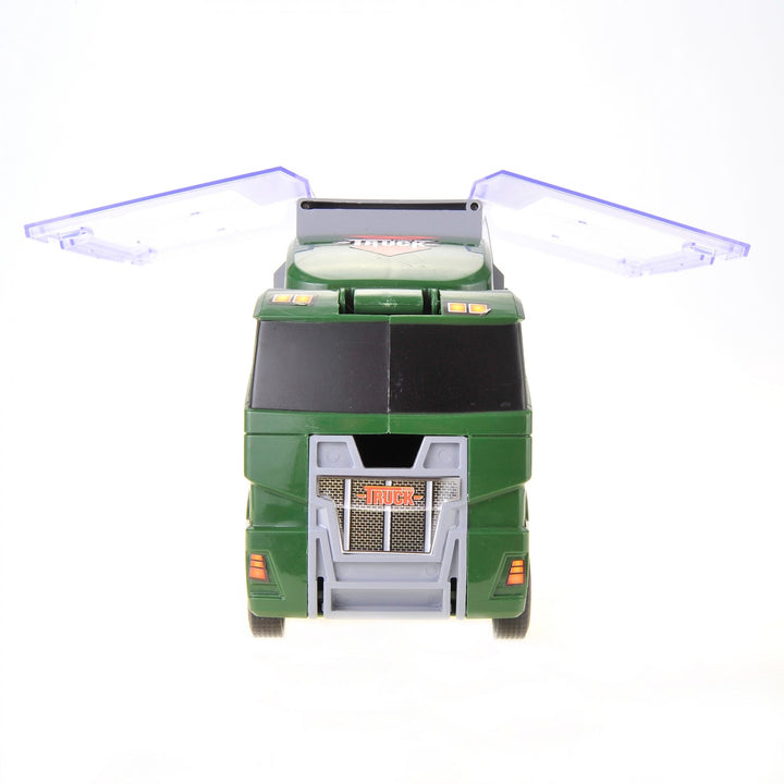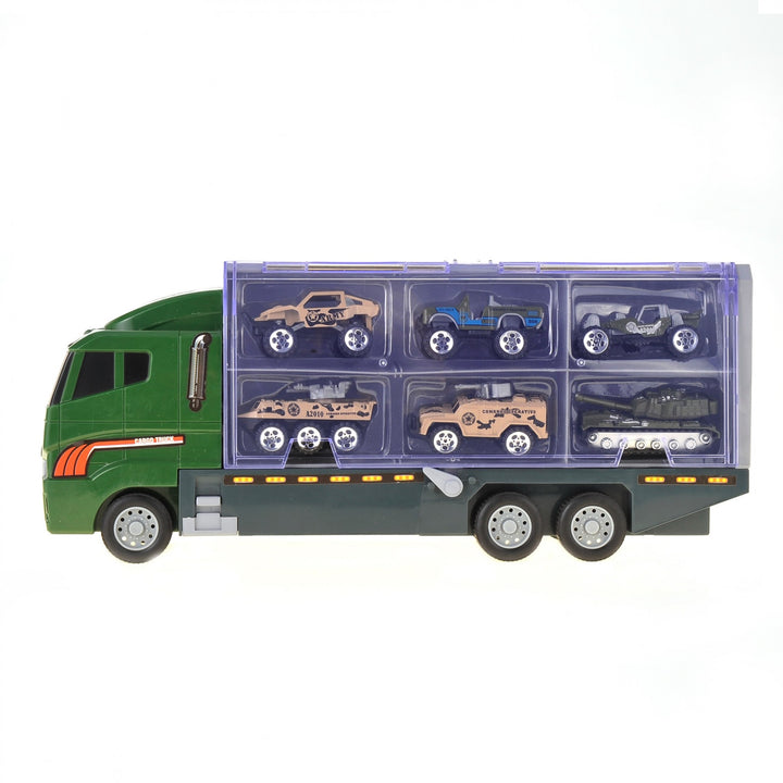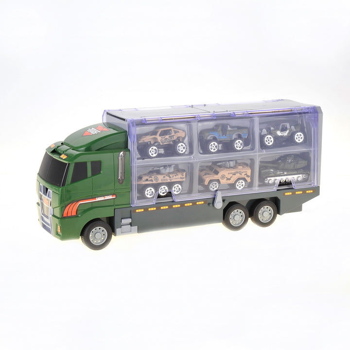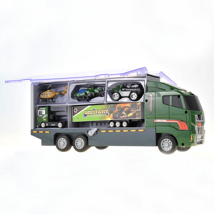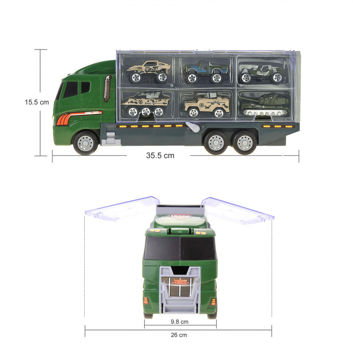 Military truck carrier is great for kids that love military toys. Comes with mini military vehicles that can easily be stored in the carrier truck. Mini vehicles has movable parts, and made with realistic design.