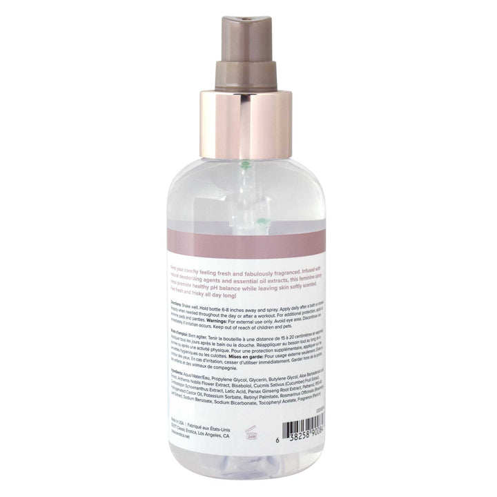 Keep your coochy feeling fresh and fabulously fragranced. Infused with natural deodorizing agents and essential oil extracts, this feminine spray helps promote healthy pH balance while leaving skin softly scented. Feel fresh and frisky all day long! Peony Fragrance.