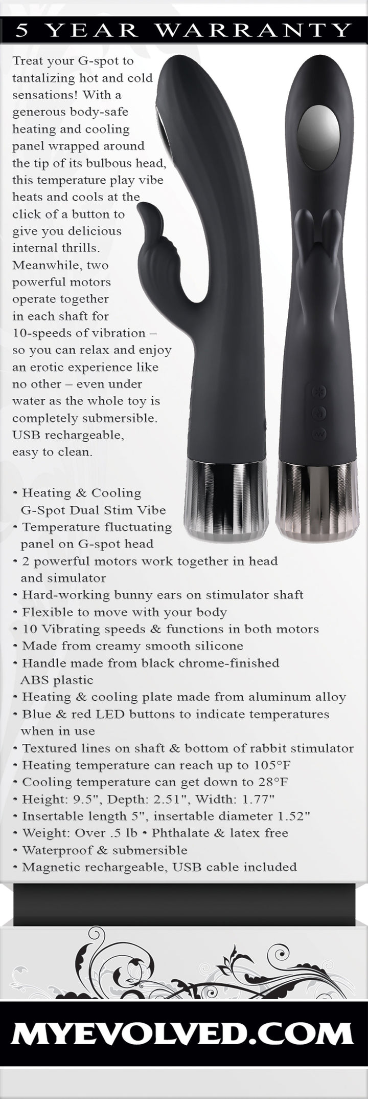 Treat your G-spot to tantalizing hot and cold sensations! With a generous body-safe heating and cooling panel wrapped around the tip of its bulbous head, this temperature play vibe heats and cools at the click of a button to give you delicious internal thrills. Meanwhile, two powerful motors operate together in each shaft for 10-speeds of vibration - so you can relax and enjoy an erotic experience like no other - even under water as the whole toy is completely submersible. USB rechargeable, easy to clean.