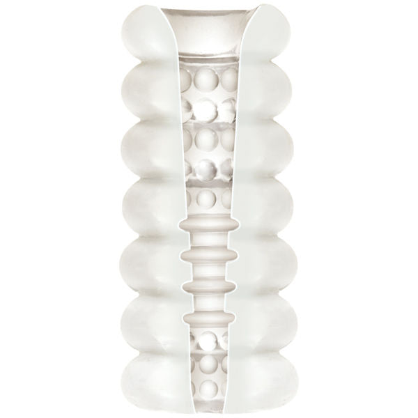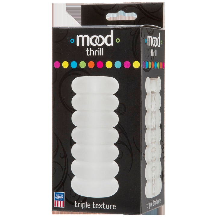Triple your fun with Mood Thrill. Made of our incredibly lifelike UR3 material this handheld stroker features three internal textures for versatile stimulation. The unique triple texture pleasure tunnel includes large massage beads at entry thick ribbing in the middle and stimulating beads tapering to a tight finish at the open-end. Easy to clean . It even warms to the touch. Your cock will thank you later.