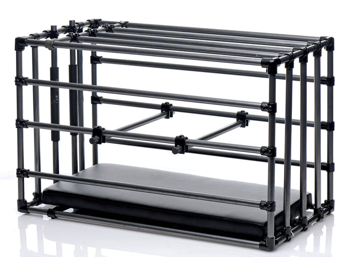 Immobilize your sub in your favorite position! The kennel is an adjustable cage with a padded board and optional positioning bars. Lock up your plaything within the coated metal enclosure and get creative! Trap their head between the front entrance bars with silicone padding so that they are perfectly positioned for force feeding. Leave in the comfortably padded leather-like board for extended role play sessions or remove it to punish a naughty pet. Positioning bars allow you to prop up their booty, feet, or chin, but you can also use them to keep their head, shoulders, and waist pushed down. Achieve the exact look that gets your blood pumping hardest! Attach their restraints, not included, to keep them in their place. This versatile cage makes an excellent addition to your dungeon or bedroom, creating a striking image as soon as your partner lays eyes on it. Assembly instructions are included.