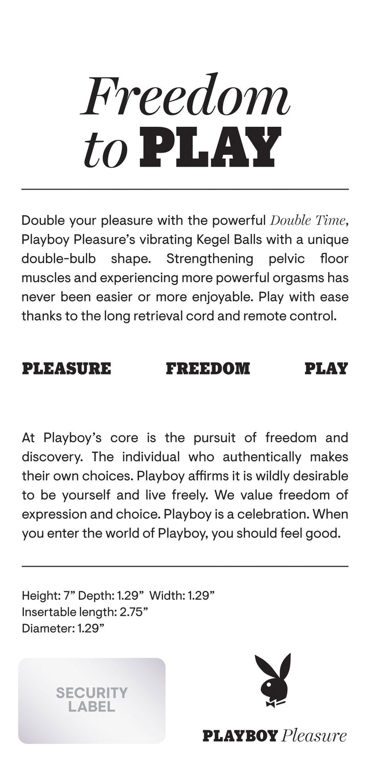 Double your pleasure with the powerful Double Time, Playboy pleasure's vibrating Kegal Balls with a unique double-bulb shape. Strengthening pelvic floor muscles and experiencing more powerful orgasms has never been easier or more enjoyable. Play with ease thanks to the long retrieval cord and remote control.