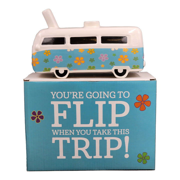 This fun and adorable novelty adult gift item features the shape of a bus with a colorful hippie style flower design on the side. Attached to the top of the bus is a pipe where you can pack your tobacco and light it. The smoke filters up to the mouthpiece at the front of the bus. This ceramic bus is fully functional and comes in a color box - the perfect gift for a trendy friend. This product is recommended for adult use only.