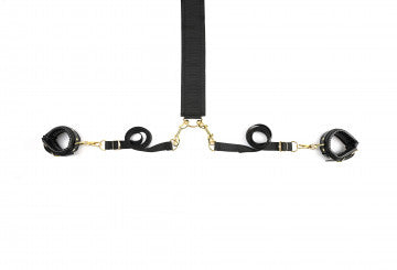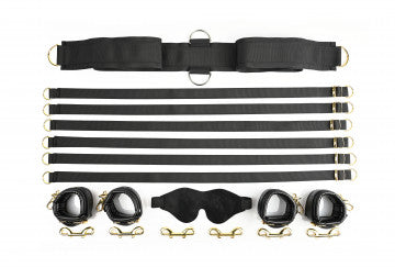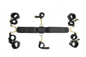 A strong nylon anchor connector strap slides under your mattress to secure six adjustable restraint straps. Four straps end in high-quality faux leather wrist and ankle cuffs with golden hardware while two are crafted with loops that promise leverage of all kinds. Position the straps around your mattress just the way you like them, tie your lover down tight, and slip the soft velvet blindfold over their eyes for a session full of surprises.