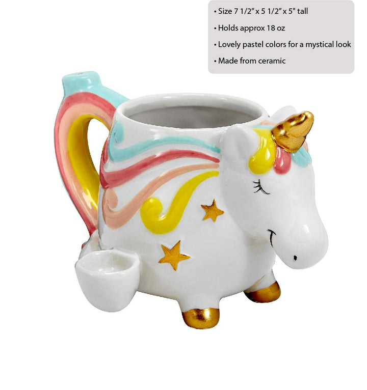 Attached to the front of the mug is a pipe where you can pack your tobacco and light it. The smoke filters up the hollow handle to the mouthpiece on the top, allowing you to enjoy a smoke with your steaming coffee. The mug holds approx 18oz. Choose a unique mystical novelty gift for a friend - Unicorns are all the the rage and are not only for children! The mug comes packaged in a color box. This product is recommended for adult use only.