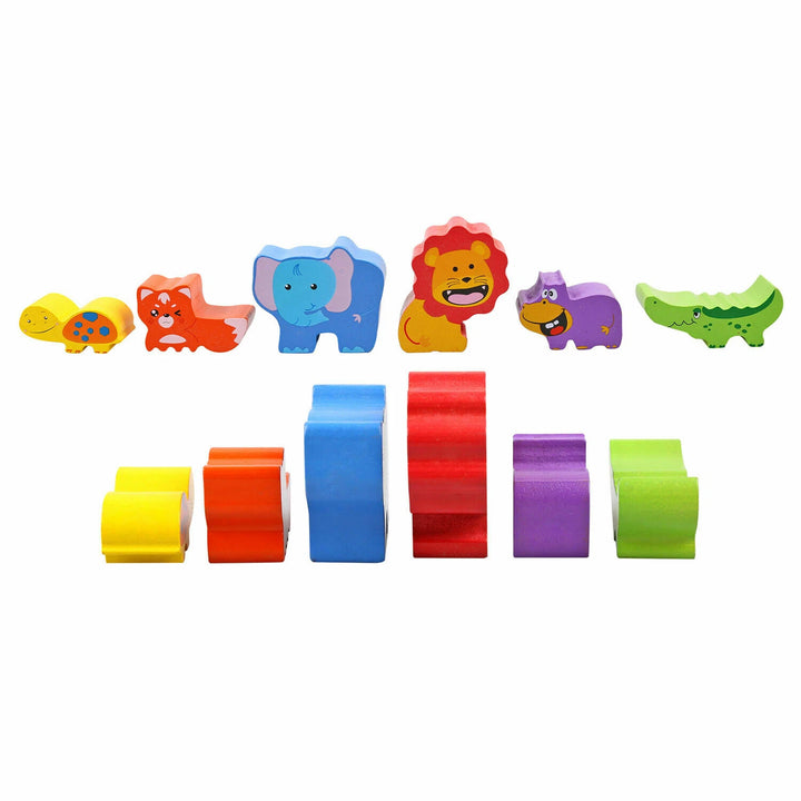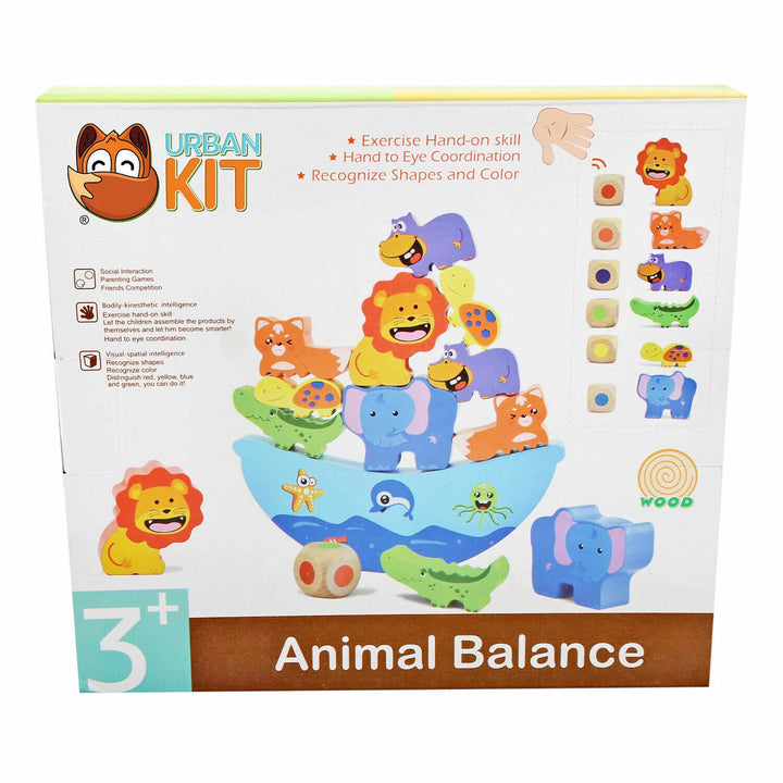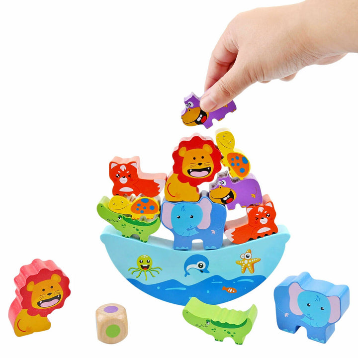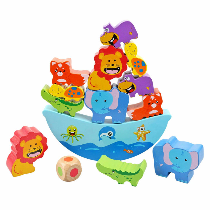 Wooden animal balance building game. Set comes with 13 wooden balance animal blocks and a boat. Stack the animals up but make sure the boat is balanced on both sides or else it will tip over. Great for kids to practice hand-eye coordination and critical thinking.