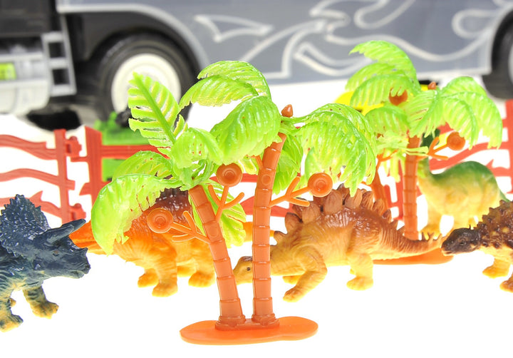 Dinosaur Transport Truck with 13 Transportable pieces. This truck will bring your kids back to the age of the dinosaur. Have immense pretend play with 6 unique dinosaur pieces along with trees and other cars to set up! This set is easily carried with the handle on the top of the truck.
