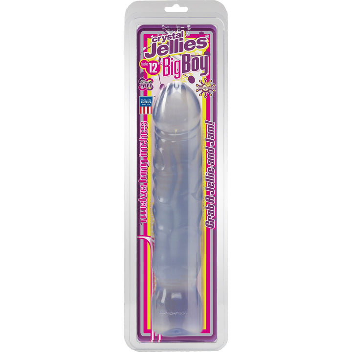 Measuring 11.5 inches of insertable length with a thick body and big realistic head. The life like shape with a slight natural curve and thick raised veins for stimulation. Flexible clear rubber jelly gives you lots of work with in terms of positioning but firm enough to satisfy once its in place.