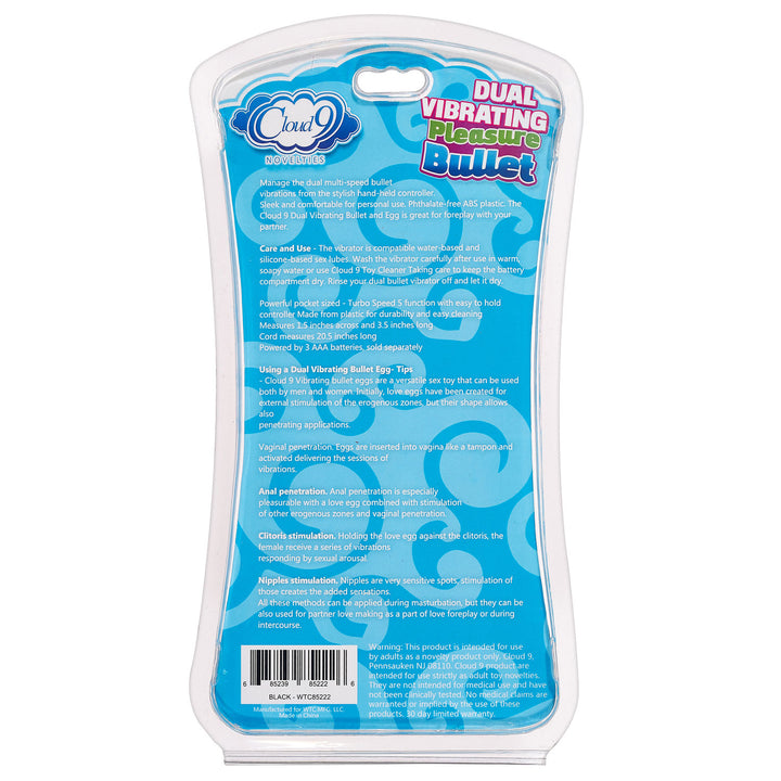 The Cloud 9 novelties duo pleasure bullet features 5 vibrating functions with wired remote control. This dual vibrating bullet is great for foreplay with your partner or for solo use! Velvety in texture and comforable for personal use, this product is made of body safe, phthalate free ABS plastic with PU coating.