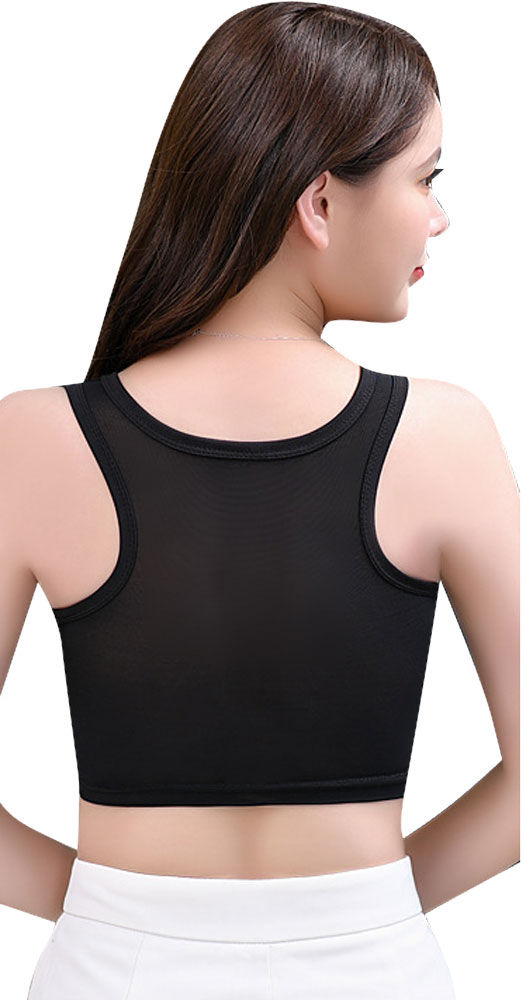 Moderate chest compression with no underwire or padding. Strong mesh provides added support and compression to minimize chest. Adjustable side hook and loop closure for custom fit. Scoop style front and back.