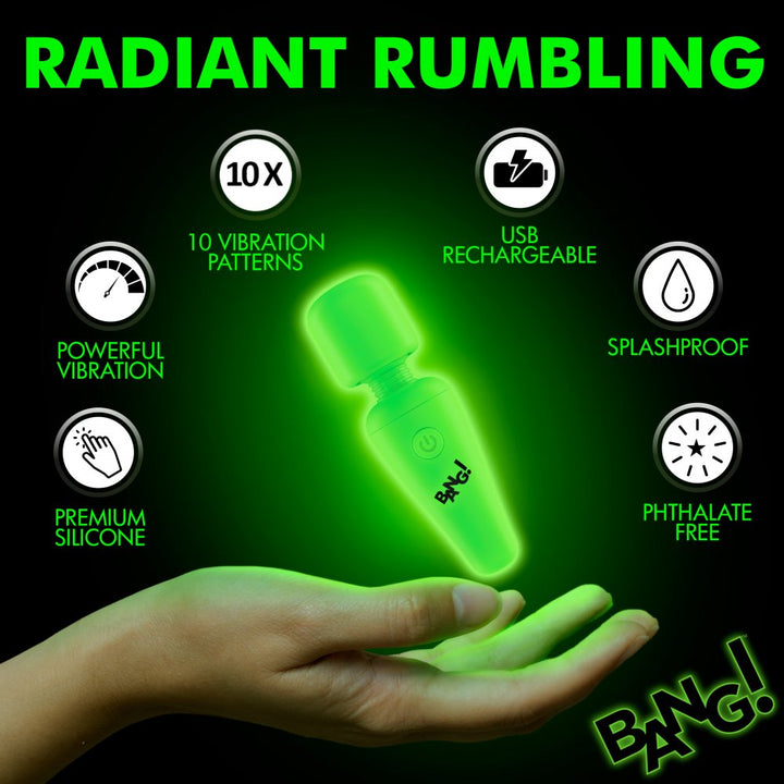 Enjoy this powerful, travel-friendly, glow-in-the-dark mini wand massager! With its wide, round head and flexible neck, you can get at any angle during your sensual massage. Expose it to light to charge up the glowing feature, then turn the lights off and have fun in the dark! This premium silicone wand is phthalate-free, body-safe, and best used with water-based lubricants only. Choose between 3 speeds and 7 patterns of vibration. Recharge via the USB cable provided. After each use, wash it with warm water and mild soap, then rinse it off and spray it with a toy cleaner. Let air dry.