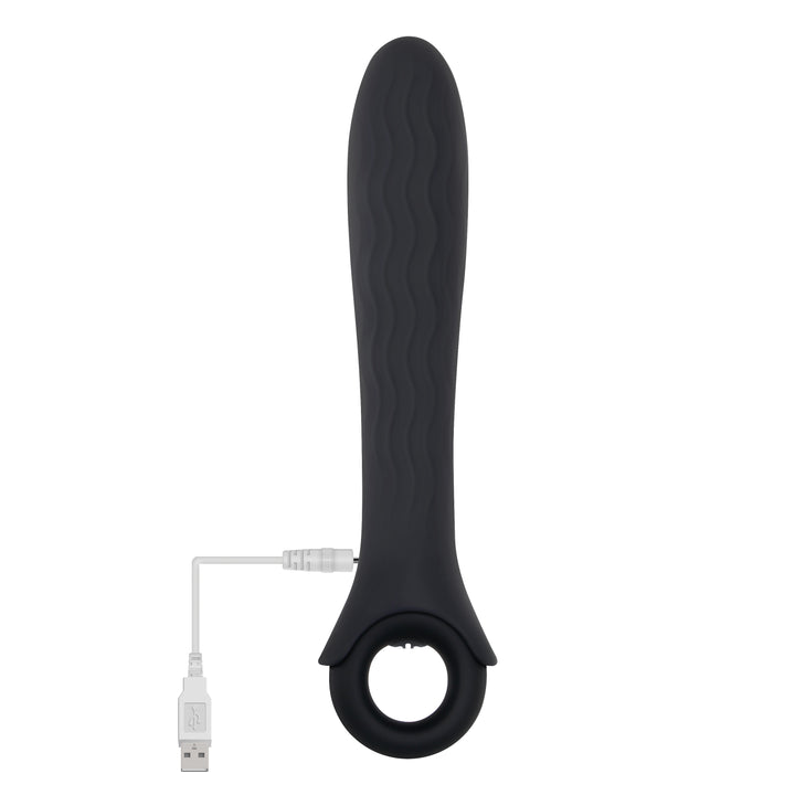 A super strong vibe for power lovers! Slip a digit through the loop handle for a steady grip - because you're going to need it! Amp up the motor through 12 zippy speeds and pulsing functions to feel the force wherever you desire it most. The wavy textured shaft and creamy silicone body is flexible to move with your body whether you're exploring inside or out, even under water as it's completely submersible. Recharge anytime via USB to keep top speeds robust and ready to please.