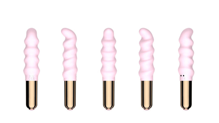 The Be Twisted Bullet Vibe will have you twist and shout with pleasure! The velvety smooth silicone shaft is sculpted from head to hilt with sensory swirls that are perfect for either intenal or external play. Featuring an ergonomic design, with luxe rose gold handle that is delightful to hold. The Be Twisted's curved head expertly pleases the G-Spot, while the shaft works to manually twist or thrust internally at your own pace, as well as to tease and stroke externally, working as a perfect 'grinding' toy for the textured-loving queens. With it's strawberry ice cream silhouette, the Be Twisted is an adorable blend of form and function that with a will have you happily screaming for more!