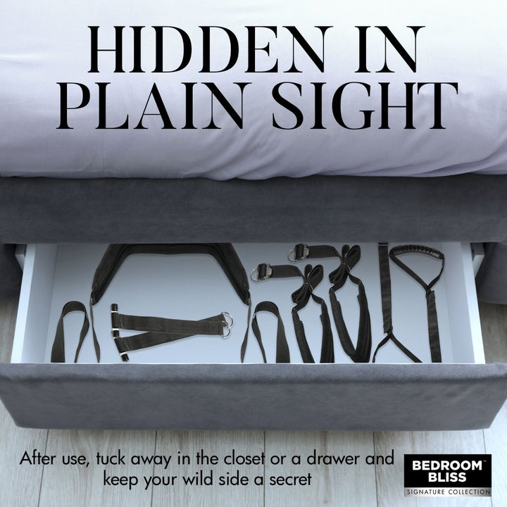 With the swing in place over the door, your partner helps lift you into place. You tug at the straps to adjust them for the perfect angle, your hips lifted and legs spread wide. They start by making their way from your lips to between your thighs and kneel on a pillow as they lick you. Once you're dripping wet, they come up for air and kiss you deeply again. They pull your hips towards them and carefully slide themselves inside. You gasp in pleasure! The angle is perfect and hits that hard-to-reach spot! They rock their hips, thrusting back and forth, until you're screaming so loud the neighbors hear! Finally your whole body convulses and a waterfall gushes out of you. Your partner laughs, grabs a towel, and comes back for more!