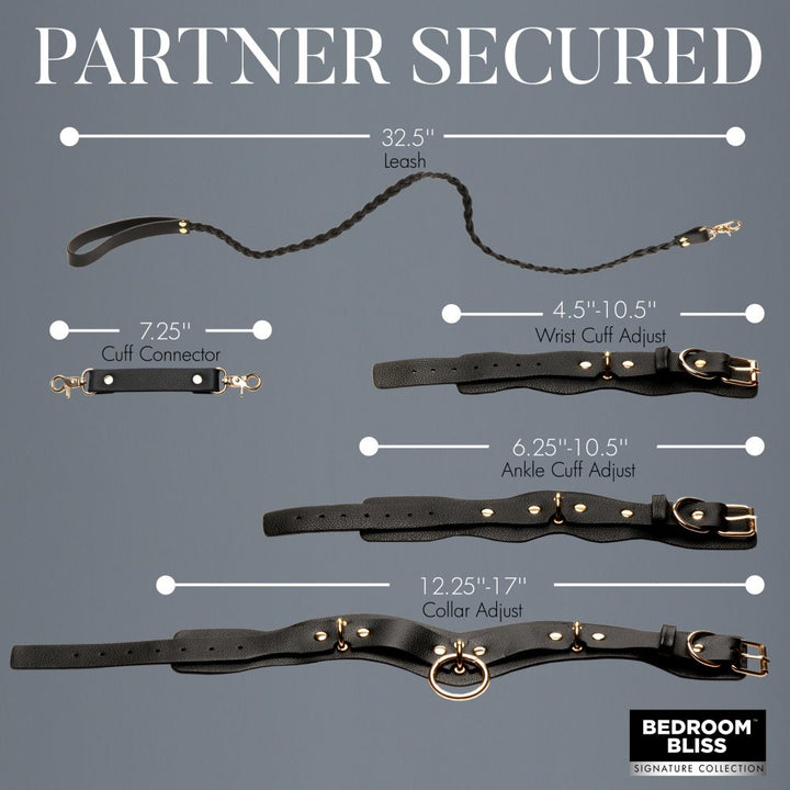 | Short Desc | Indulge in guilt-free, high quality, vegan leather that looks like the real thing and feels amazing to wear! This set includes wrist cuffs, ankle cuffs, a collar with braided leash, and 2 cuff connectors. Wear it yourself or surprise your partner and enjoy how kinky your evening and relationship can become! All of the cuffs and the collar are adjustable. Simply use the buckles for a custom, comfortable and snug fit. All metal is nickel-free for sensitive skin and has a gorgeous, golden color that stands out against the black vegan leather. Each of the straps have D-rings so you can use the connectors to attach wrist and ankles together or connect other bondage gear to it! To clean it, simply wipe clean with a soft, damp cloth. To remove stains, use unscented soap and simply rub some into the stain, and wipe off with a damp cloth. To dry, wipe down with a dry cloth. Cuffed by their ankles and wrists, you attach the connectors to keep them fully restrained. You lovingly attach the collar around their neck, kiss them and then attach the leash. They bite their lip, eager to surrender and serve. You lift up their chin and then turn them onto all fours. First, you take out the flogger to warm them up. Then you use your bare hand. By the time you get to the paddle they are crying out loud! Their cries of pain turn to moans of pleasure and you can visibly see how excited and turned on they are. You flip them over, release the cuffs, and then re-cuff them to the bed before having your way with them! Measurements : Wrist cuffs adjust from 4.5 inches to 10.5 inches in circumference. Ankle cuffs adjust from 6.25 inches to 10.5 inches in circumference. Cuff connectors are 7.25 inches in length (including clips). Collar adjusts from 12.25 inches to 17 inches circumference. Leash is 32.5 inches in overall length. Materials : Vegan leather, metal Color : Black, gold |