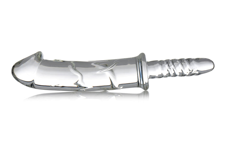 With a flared cock head and veiny shaft, this sparkling glass thruster is as pleasing to the eye as it is to the rest of your body! The cock head comes to a moderate point, to help with insertion. The ribbed handle makes for an easy grip, or you can even turn it around for a smaller insertable! The non-porous nature of the body-safe glass makes it the perfect body safe material. Compatible with all lubes, the durable glass is perfect for anal or vaginal use. Since it is so easy to sterilize, it is also great for sharing! The durable and beautiful borosilicate glass makes it a thrilling option for temperature play, and is sure to last you for years and years!