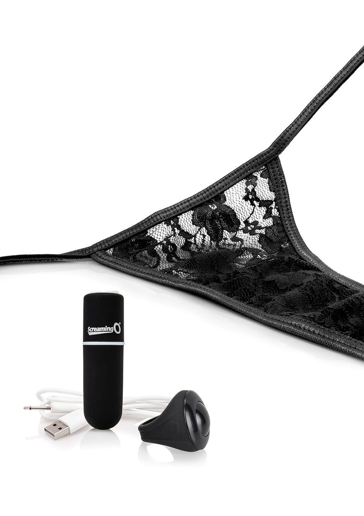 Rechargeable vibrating panty set with remote control ring. Lace side-tie panties in a one size fits most size features a secret pocket to keep your vibe right where you want it! (Fits up to 60" waist). Vooom rechargeable bullet with 10 functions that wirelessly sync with remote-control ring or works on its own. The remote is disguised as a ring! Discreet push-button remote looks like an ordinary finger ring and works up to 50 feet away! Made of stretchy silicone to fit almost any size finger.