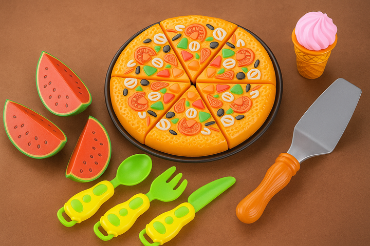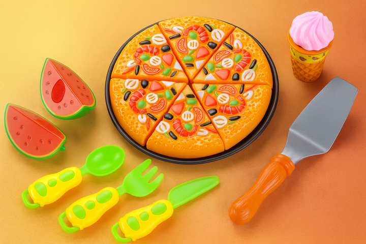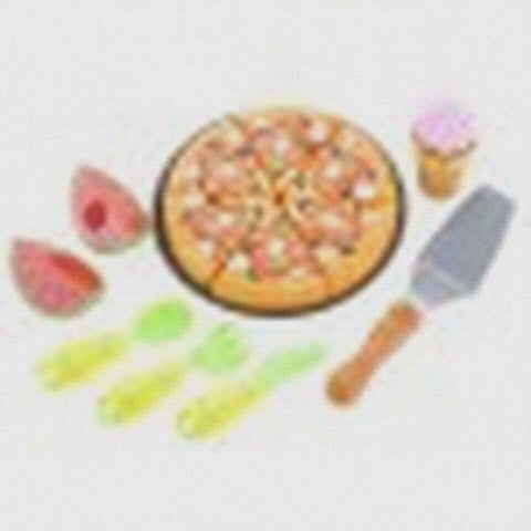It's party time! This pizza looks delicious! This pizza pie can be sliced into 6 slices. Velcro holds the slices together. Also comes with 2 piece watermelon and ice cream. Includes spatula, knife, spoon, and fork. Putting back the pizza, watermelon, and ice cream together is fun and improves puzzle-solving skills! Your kids will love this pizza set!