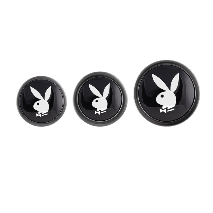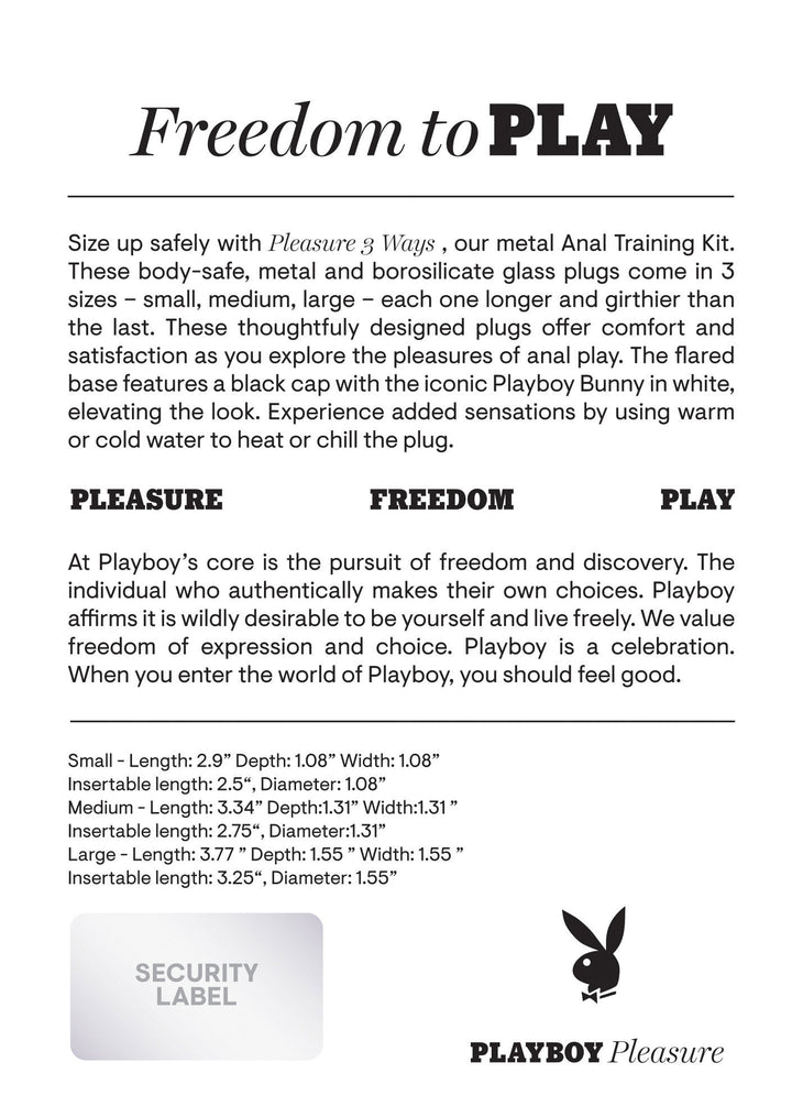 Size up safely with Pleasure 3 Ways, the metal Anal Training Kit. These body-safe, metal and borosilicate glass plugs come in 3 sizes - Small, Medium, Large - each one longer and girthier than the last. These thoughtfuly designed plug offers comfort and satisfaction as you explore the pleasure of anal play. The flared base features a black cap with the iconic Playboy Bunny in white, elevating the look. Experience added sensations by using warm or cold water to heat or chill the plug.