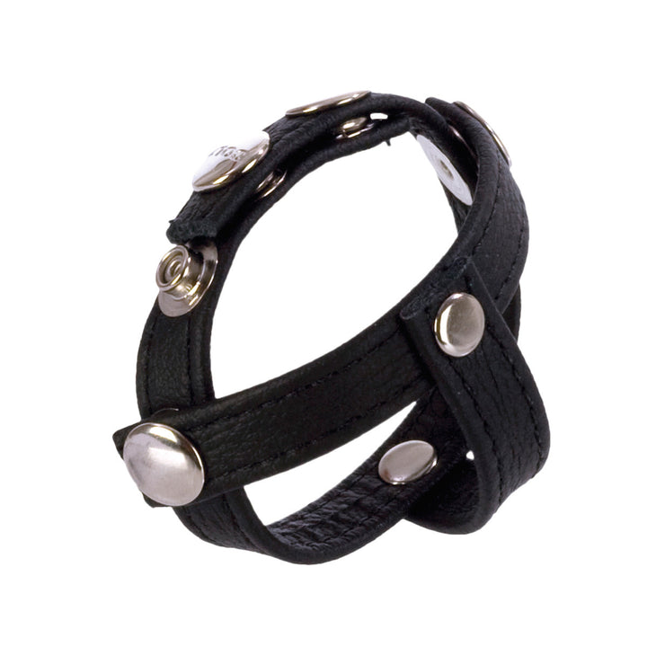 A world divided in ecstasy is the offering from the COLT Leather H-Piece Divider Strap. A snug fit around the cock with a gentle embrace around each ball will create the masculine look that defines COLT. Everything about the COLT Leather H-Piece Divider Strap is meant to convey the inner bad boy in you. No one will mistake that you'll bring erotic play to all new heights with this leather cock and divided ball strap. There's nothing subtle about this chrome-studded, black leather hero. This soft black leather divider strap provides an extra lift for your cock while splitting the twins for pure enjoyment during play and at climax.