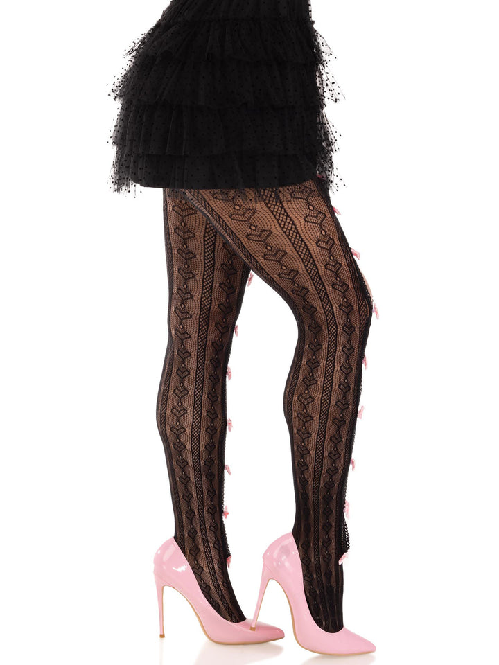 Sweetheart Striped Net Tights With Keyhole and Mini Bow Detail - One Size - Black