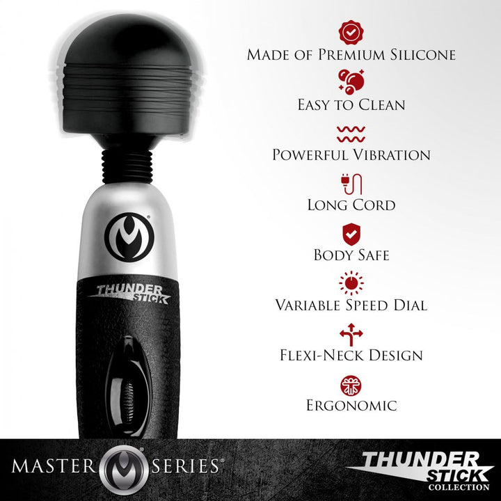 | Short Desc | Same incredible power as the original, now with a silicone head and a sleek, modern makeover The Thunderstick is the perfect vibrating massage wand, providing you with a smooth, variable speed dial that allows you to play with intensities that range from a delicate, low hum to a knee-shaking thrum. The flexible neck allows you to find the right angle without straining your wrist. Whether you are playing solo, with a partner, or even enjoying forced orgasm or orgasm denial play, the textured body ensures a secure grip. Just plug it in and experience the most powerful vibration in its class This new version of the Thunderstick is easier than ever to clean, made with non-porous and phthalate-free silicone. To preserve the material, do not use with silicone lubricants. Measurements: 13 inches in total length. Head is 2.4 inches in diameter. Cord measures 65 inches in length. Material: Silicone, ABS plastic. Color: Black and silver. Note: 110 volt power cord. |