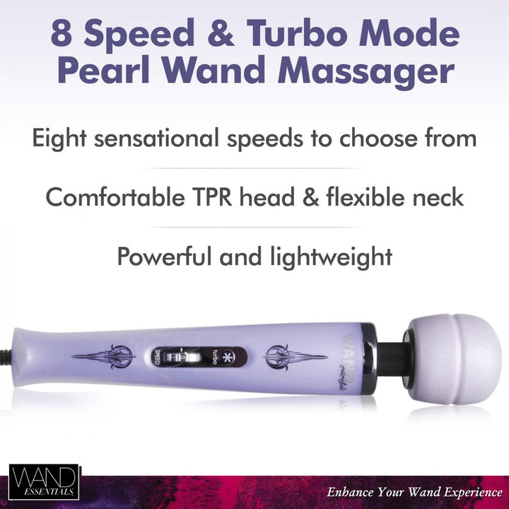 | Short Desc | The Wand Essentials Turbo Pearl is a variable speed, electric wand massager with a Turbo button that takes your massage to a whole new level Lay back and find the speed that suits you, press the Turbo button, and let this powerful wand take over with amplified vibration, doubling and tripling the power You can also create your own pulse pattern by finding your desired setting and pressing the Turbo button over and over again, taking a level 3 speed to a level 8 with a push of a button. Imagine the possibilities Whether you want a soothing sensation, a deep-tissue massage, or total erotic arousal, the Turbo Pearl Massager delivers powerful pleasure just the way you want it. Measurements: 12.5 inches overall length, 2.42 inch diameter massage head, Material: TPR, ABS, Color: Light Purple Pearl, Note: 110V - US Voltage |